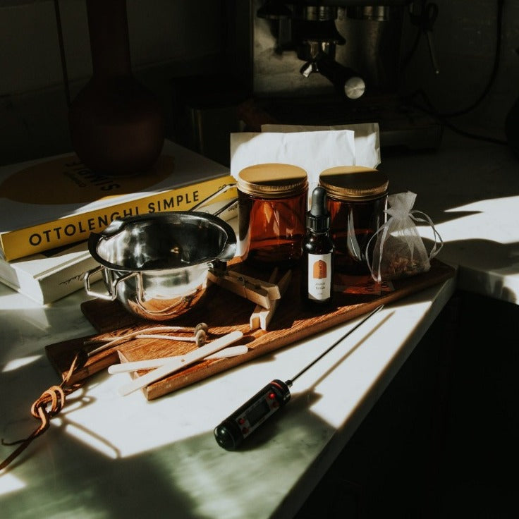 • Stainless steel melting & pouring pot, natural soy wax for two candles, amber glassware, eco natural fibre wicks, wick glue stickers, candle labels, safety stickers, wick peg, and digital thermometer
